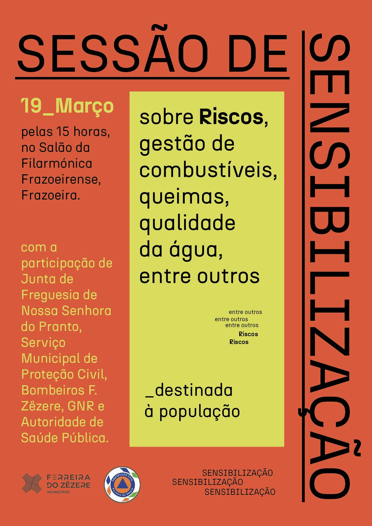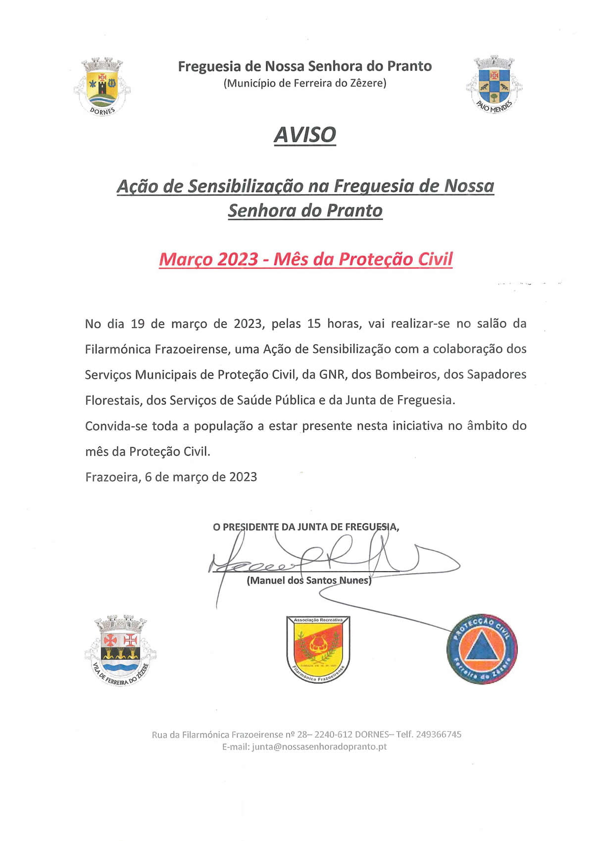 No dia 19 de março de 2023, pelas 15 horas, vai realizar-se no salão da Filarmónica Frazoeirense, uma Ação de Sensibilização com a colaboração dos Serviços Municipais de Proteção Civil, da GNR, dos Bombeiros, dos Sapadores Florestais, dos Serviços de Saúde Pública e da Junta de Freguesia.