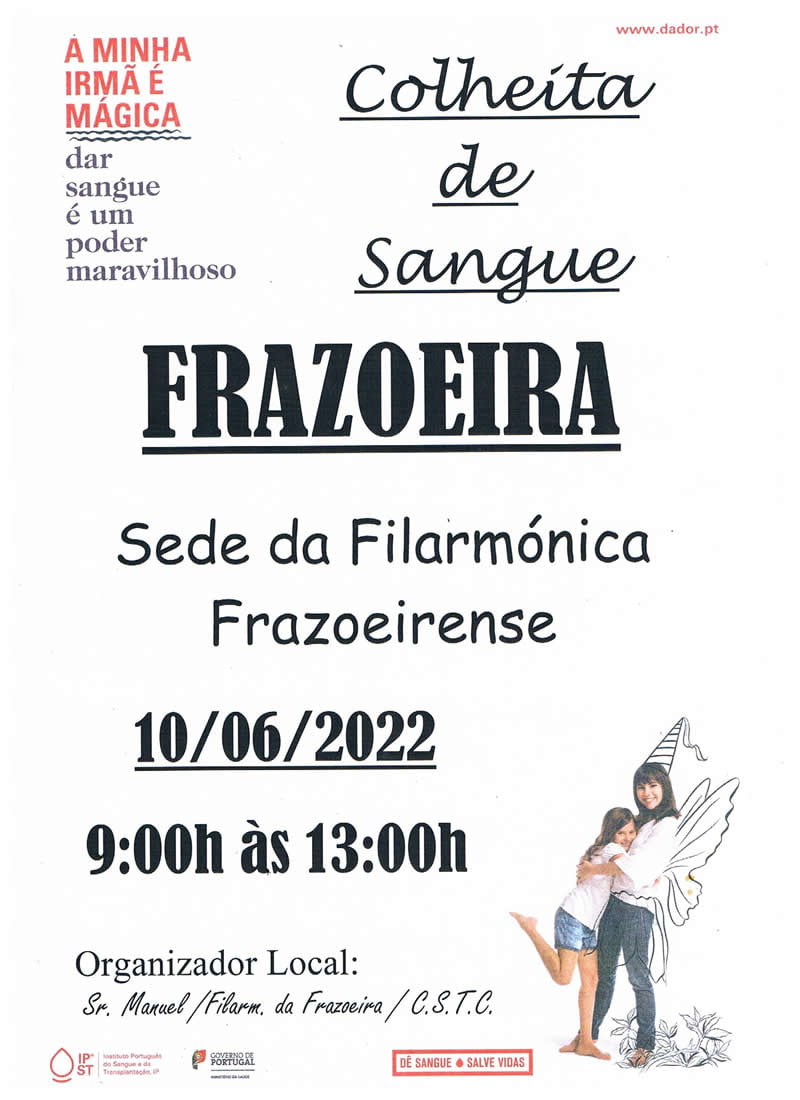 Colheita de Sangue na sede da Filarmónica Frazoeirense, no dia 10 de junho de 2022, das 09h00 às 13h00. Dar sangue é um poder maravilhoso.