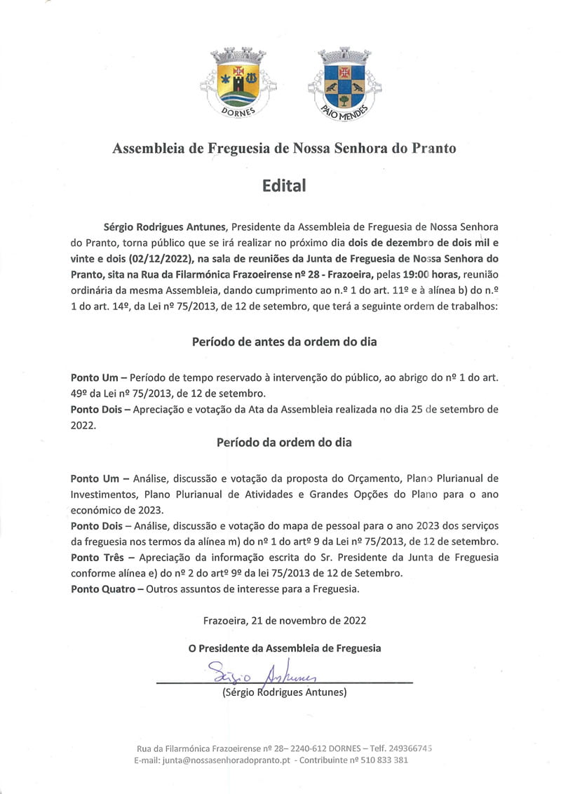 Sérgio Rodrigues Antunes, Presidente da Assembleia de Freguesia de Nossa Senhora do Pranto, torna público que se irá realizar no próximo dia dois de dezembro de dois mil e vinte e dois (02/12/2022), na sala da Associação Recreativa Filarmónica Frazoeirense, sita na Rua da Filarmónica Frazoeirense nº 68 – Frazoeira, pelas 19:00 horas.