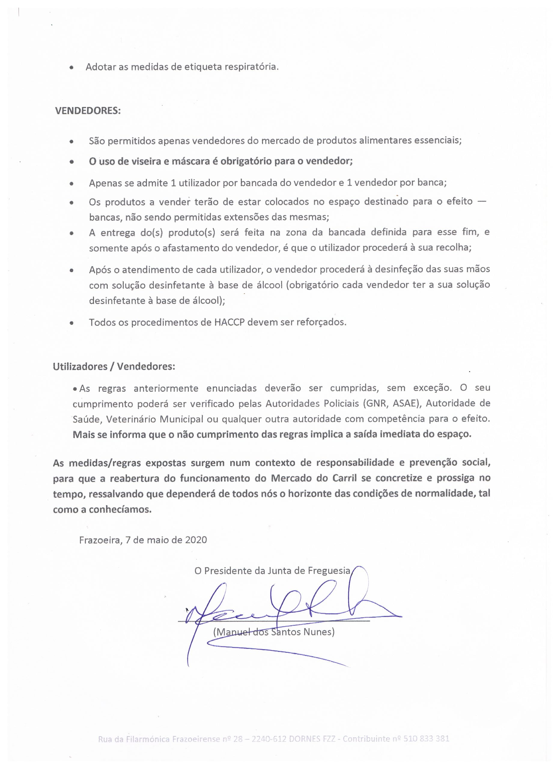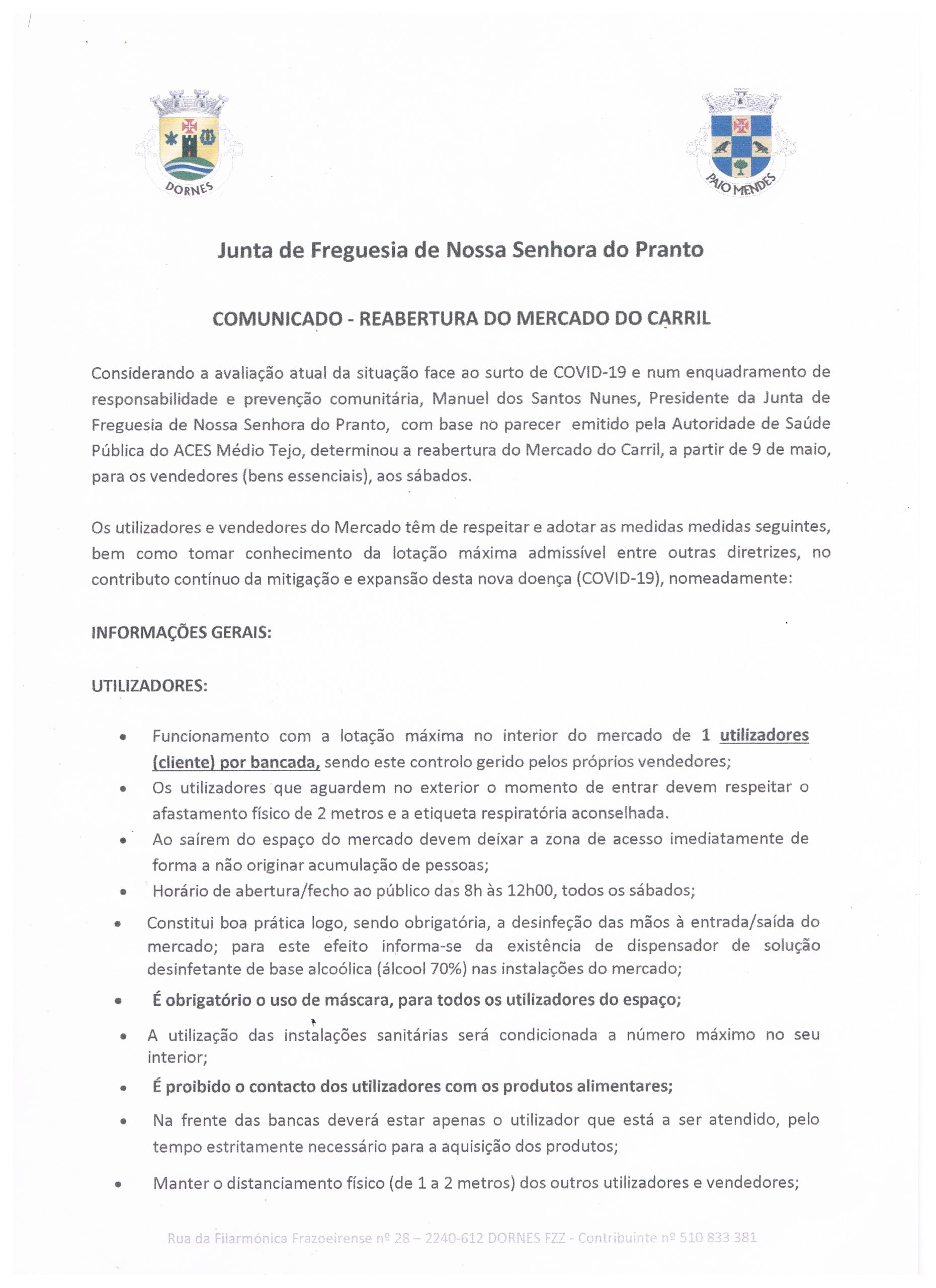 Considerando a avaliação atual da situação face ao surto de COVID-19 e num enquandramento de responsabilidade e prevenção comunitária, Manuel dos Santos Nunes, Presidente da Junta de Freguesia de Nosssa Senhora do Pranto, com base no parecr emitido pela Autoridade de Saúde Pública do ACES Médio Tejo, determinou a reabertura do Mercado do Carril, a partir de 9 de maio para os vendedores (bens essenciais), aos sábados.